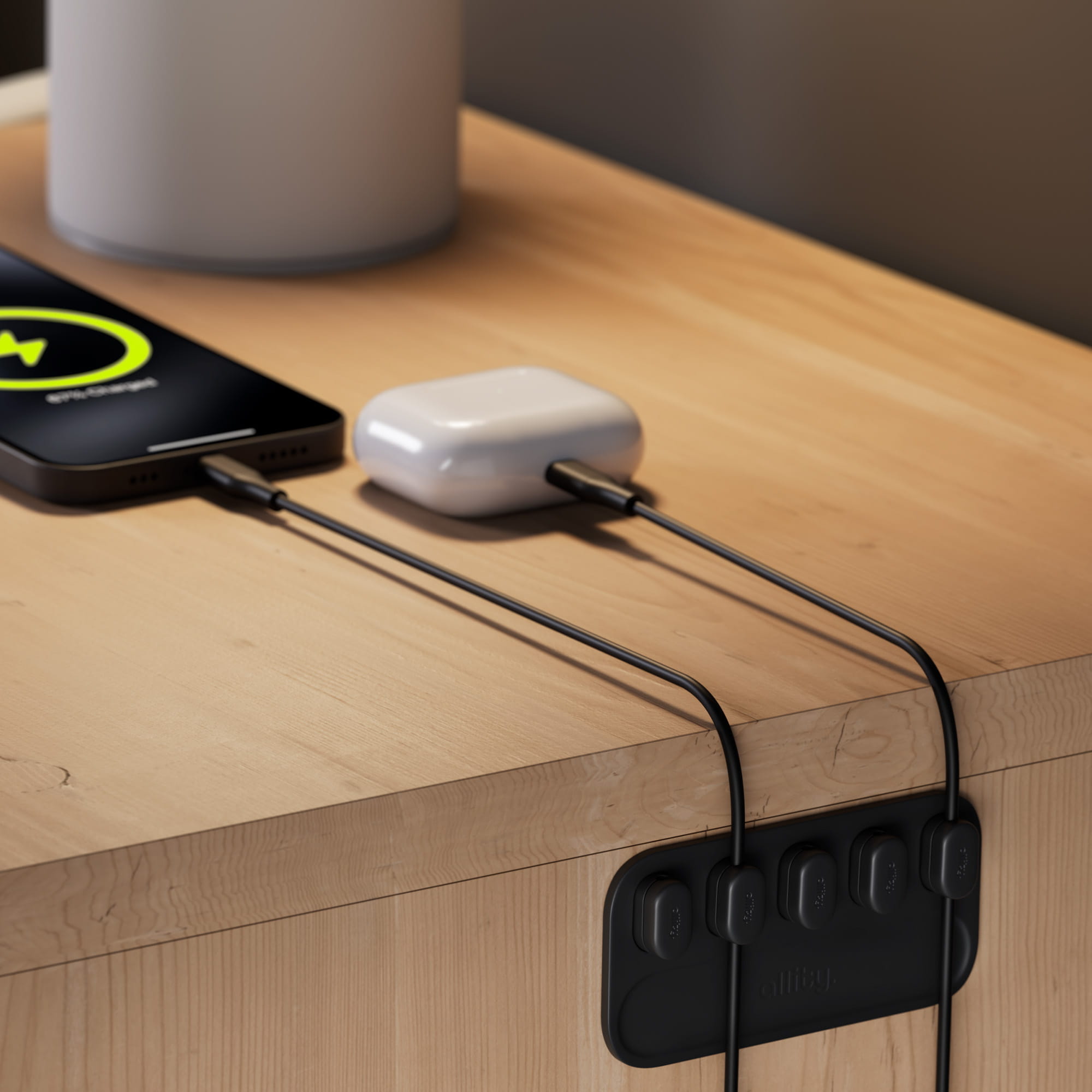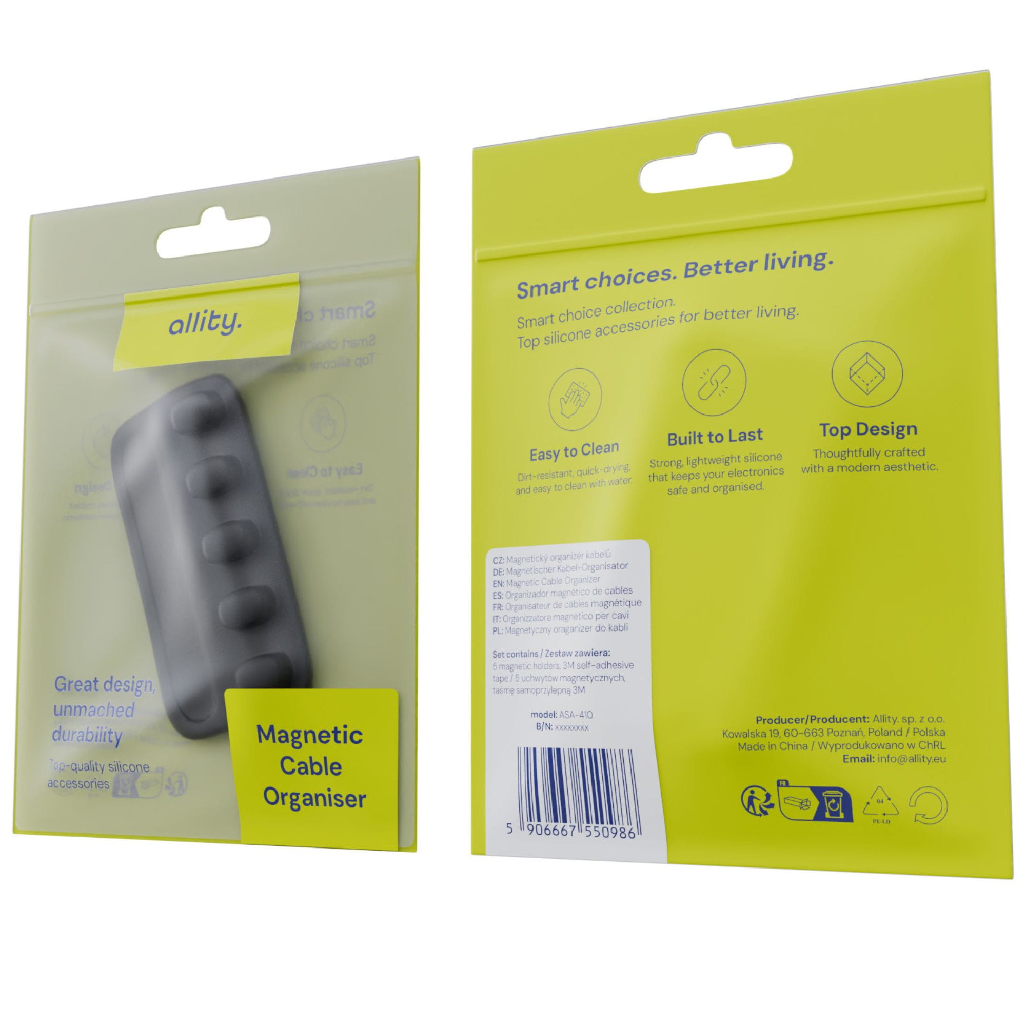 W Allity wiemy, jak ważne jest, aby za estetycznym produktem stała wysoka jakość. Dlatego nasz uchwyt na kable jest wyprodukowany z wysokiej klasy silikonu, który jest przyjemny w dotyku i trwały. Organizer na kable Allity to wytrzymałość i estetyka na długo - nawet przy intensywnym użytkowaniu.