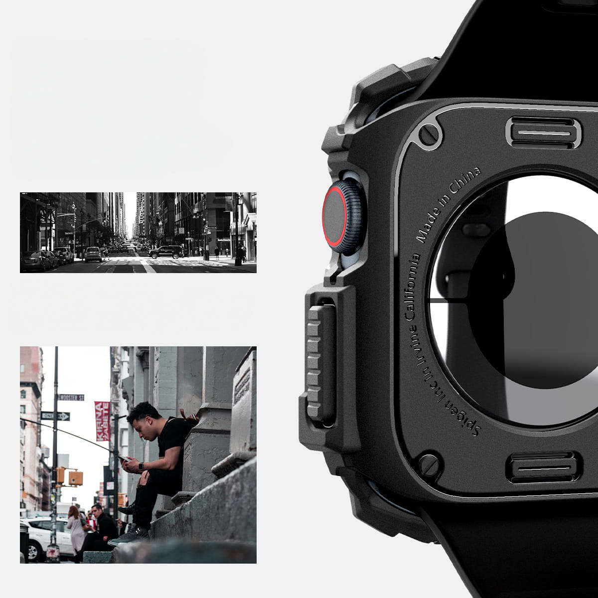 Oryginalne etui marki Spigen z serii Rugged Armor wykonane z wysokiej jakości miękkiego, termoplastycznego poliuretanu zapewnia wysoką ochronę przed zarysowaniami i uderzeniami. Staranne wykonanie świetnie się prezentuje na ręce, a pancerna stylistyka wraz z drobnymi akcentami na wzór karbonu zdecydowanie odmienią wygląd Twojego smart-zegarka.
