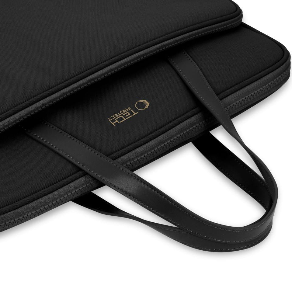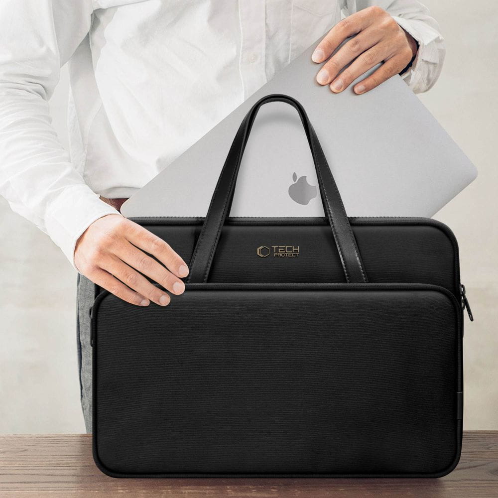 Tech-Protect Carrying Bag to pokrowiec na laptopa z uchwytami na rękę z ekoskóry oraz dodatkową kieszenią na akcesoria. Stworzony z wodoodpornego materiału i miękkiej pianki chroni urządzenia przed uszkodzeniami, a nowoczesny wygląd sprawia, że nadaje się do użytku domowego i firmowego.