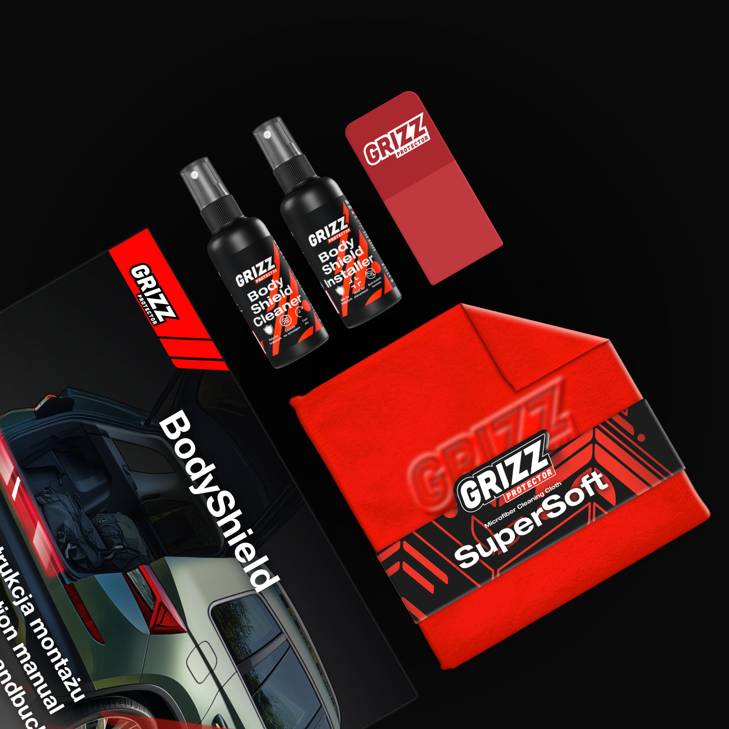 Wyczyść dokładnie wybrany element przy użyciu płynu BodyShield Cleaner oraz ściereczki z mikrofibry, a następnie obficie spryskaj go żelem BodyShield Installer. Zerwij folię z podkładu, spryskaj tylną stronę folii żelem i ułóż ją na mokrej powierzchni. Wyrównaj i ostrożnie wygładź raklą folię od środka na zewnątrz, usuwając żel - bez silnego docisku. Korzystając z ściereczki oraz BodyShield Cleaner ostrożnie wyczyść oklejony element usuwając nadmiar żelu. Po montażu folii nie myj auta przez 3 - 4 dni. Na finalny efekt zaczekaj od 48h do 64h.