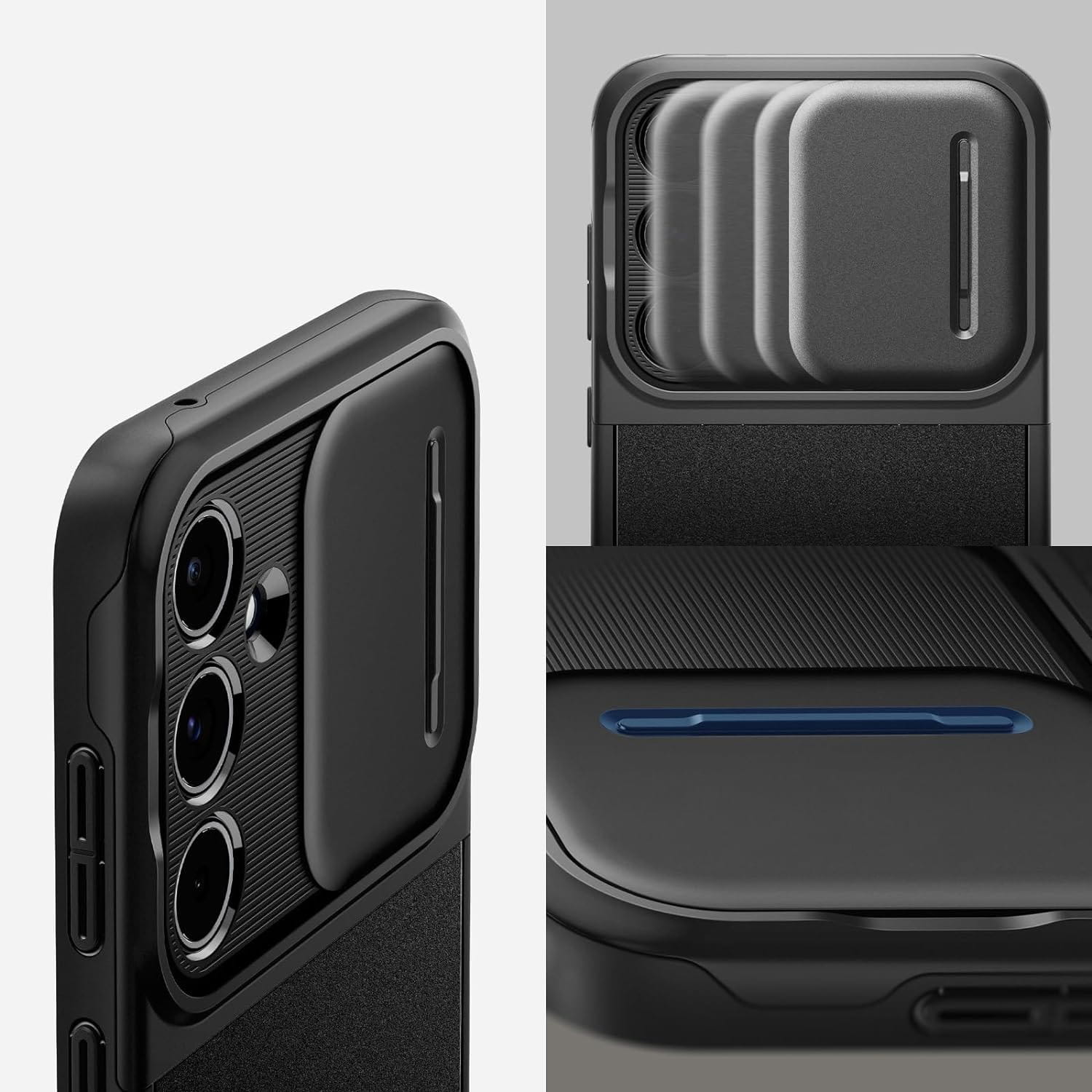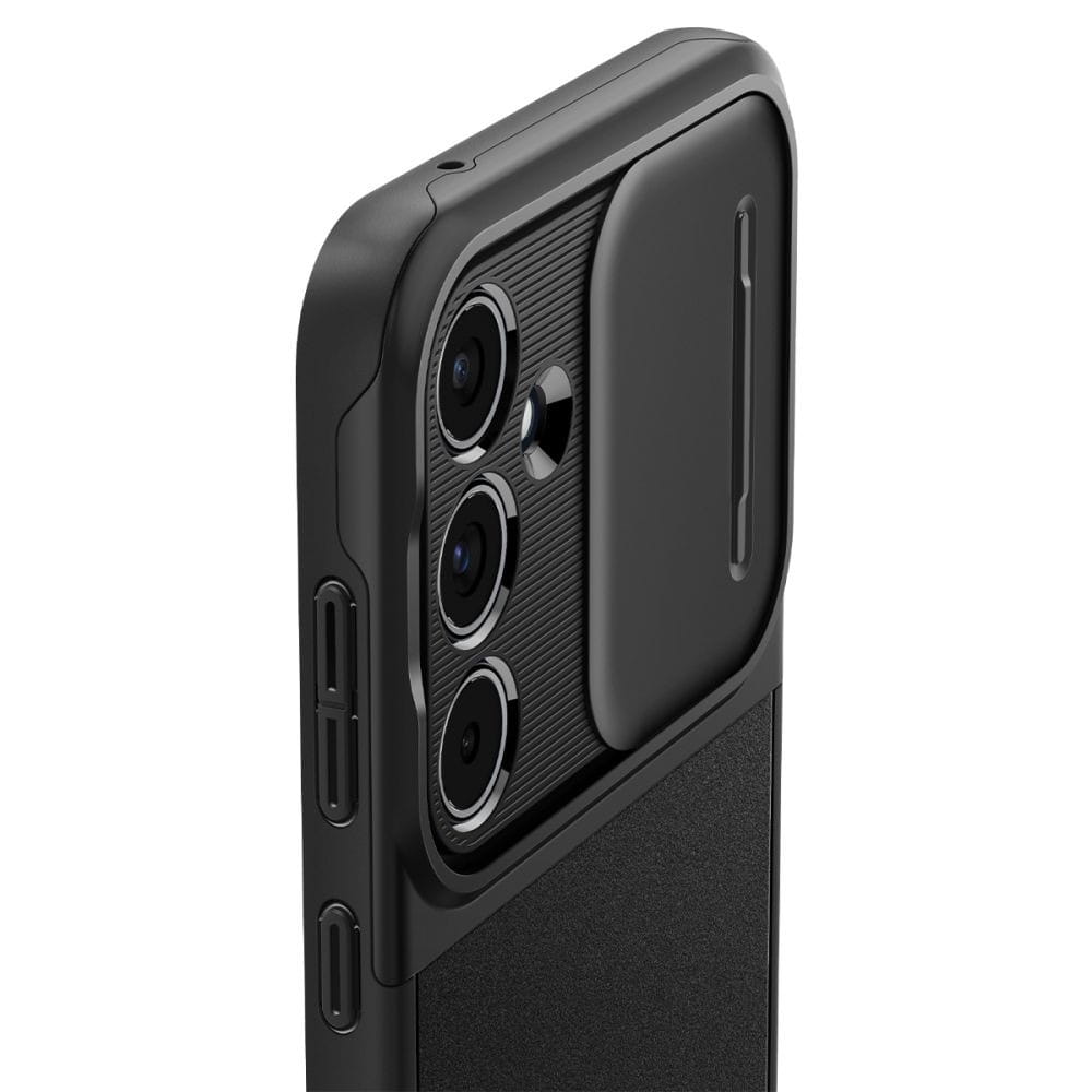 Nowoczesne etui od marki Spigen z serii Optik Armor charakteryzujące się mocną, poliwęglanową osłoną na wyspę aparatów urządzenia z przesuwnym panelem, pozwalającym na całkowite zakrycie sekcji obiektywów dla jeszcze większej ochrony kamer.