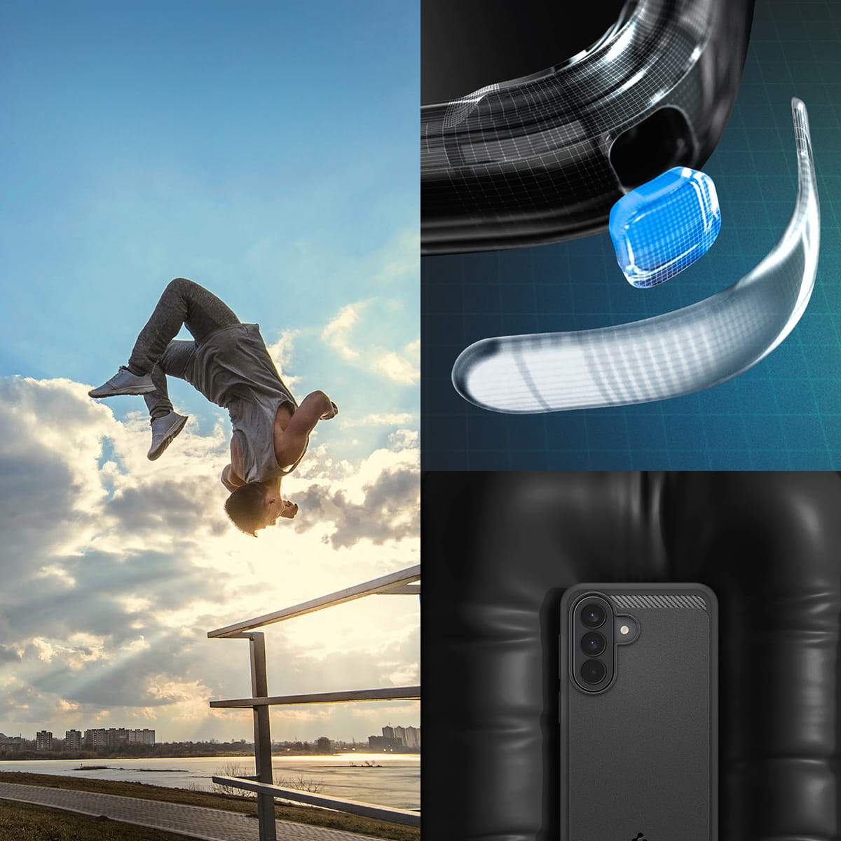 Etui zapewnia solidną ochronę przy minimalnych gabarytach oraz wadze podczas upadków. Dzięki technologii Air Cushion®, czyli poduszek powietrznych umiejscowionych w narożnikach, skutecznie amortyzuje wstrząsy od upadków, dorównując tym samym wymogom standardu odporności Mil-Grade.