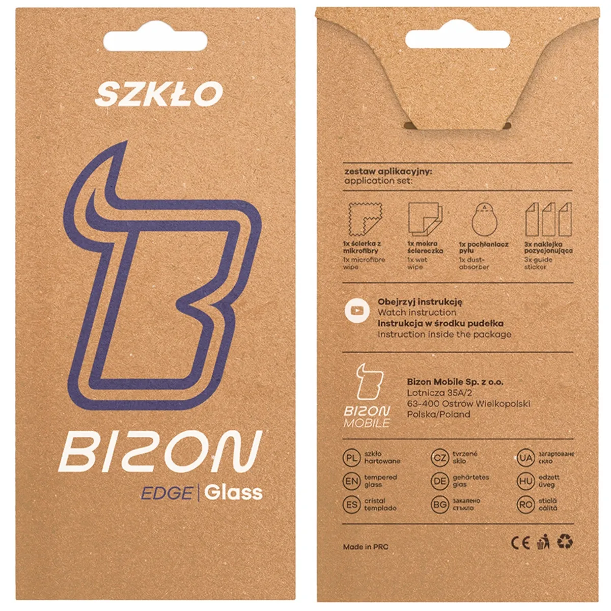 Bizon Glass Edge, oprócz 1 sztuki szkła hartowanego, zawiera również mokrą ściereczkę, suchą ściereczkę z mikrofibry, Dust Absorbera i 3 naklejki pozycjonujące.