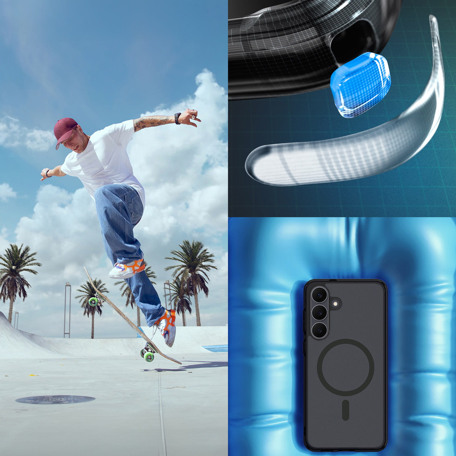 Etui zapewnia solidną ochronę przy minimalnych gabarytach oraz wadze podczas upadków. Dzięki technologii Air Cushion®, czyli poduszek powietrznych umiejscowionych w narożnikach, skutecznie amortyzuje wstrząsy od upadków, spełniając wymogi standardu odporności Mil-Grade.