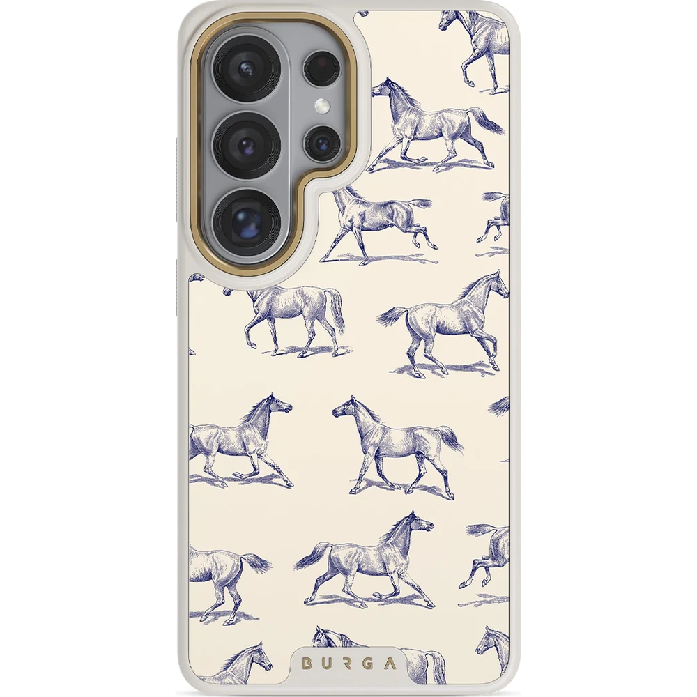 Kolor producenta: Derby Race Gold - Etui w jasnej, kremowej kolorystyce z eleganckim motywem koni nawiązuje do jeździeckiego dziedzictwa i ponadczasowego stylu, a złota ramka wokół aparatu podkreśla jego wyrafinowany, luksusowy charakter.
