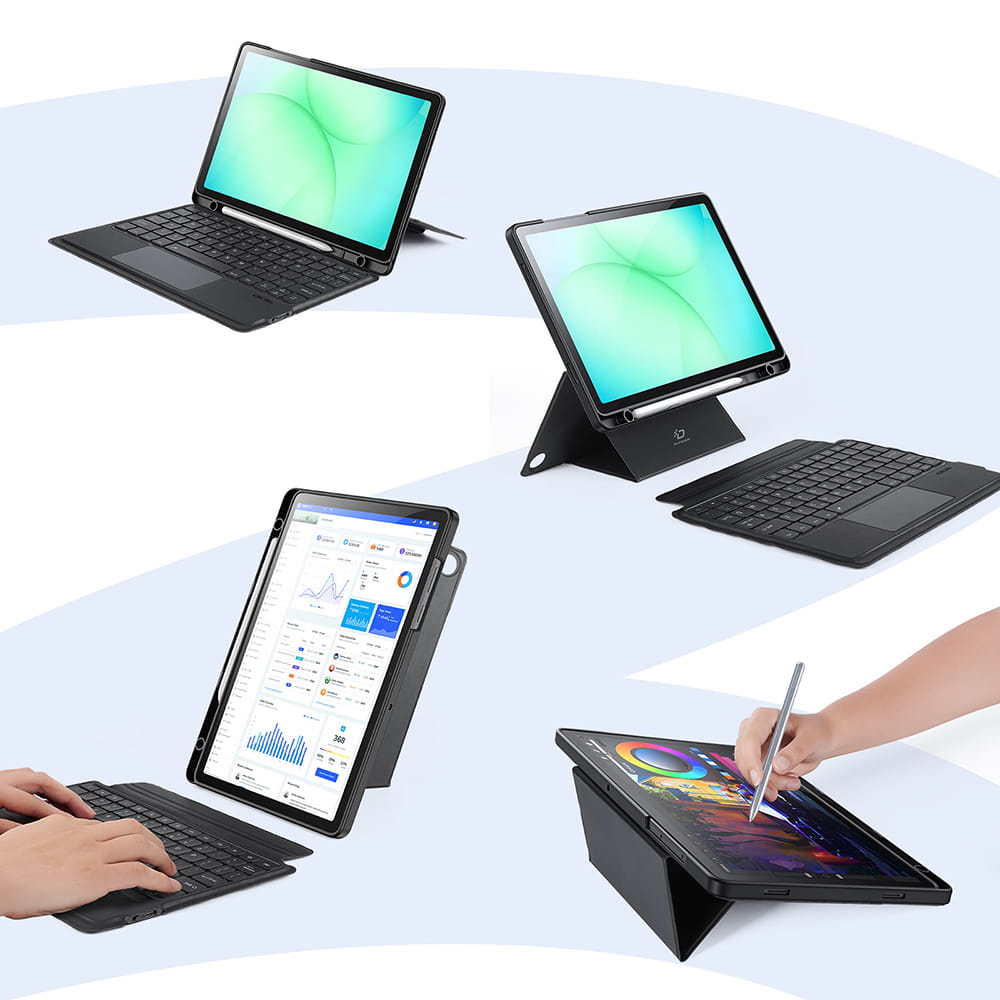 Etui magnetyczne i klawiatura QWERTY US z Bluetooth 5.0 wyposażona w touchpad od marki Dux Ducis z serii DK łączy elegancję i funkcjonalność. To idealne rozwiązanie dla użytkowników pragnących maksymalnie wykorzystać możliwości swojego urządzenia. Case wykonany został z poliuretanu oraz TPU. Kombinacja tych dwóch materiałów nie tylko zapewnia trwałość, ale także dodaje estetycznego wyglądu.