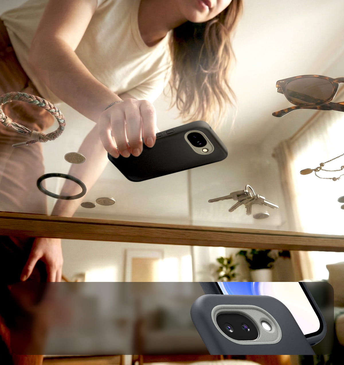Elastyczny materiał TPU bardzo dobrze amortyzuje wstrząsy i chroni urządzenie przed zarysowaniami i skutkami uderzeń. Twardy poliwęglan z wystającą ramką wokół aparatu zapewnia dodatkowe zabezpieczenie soczewek.