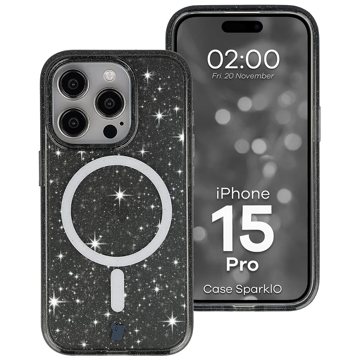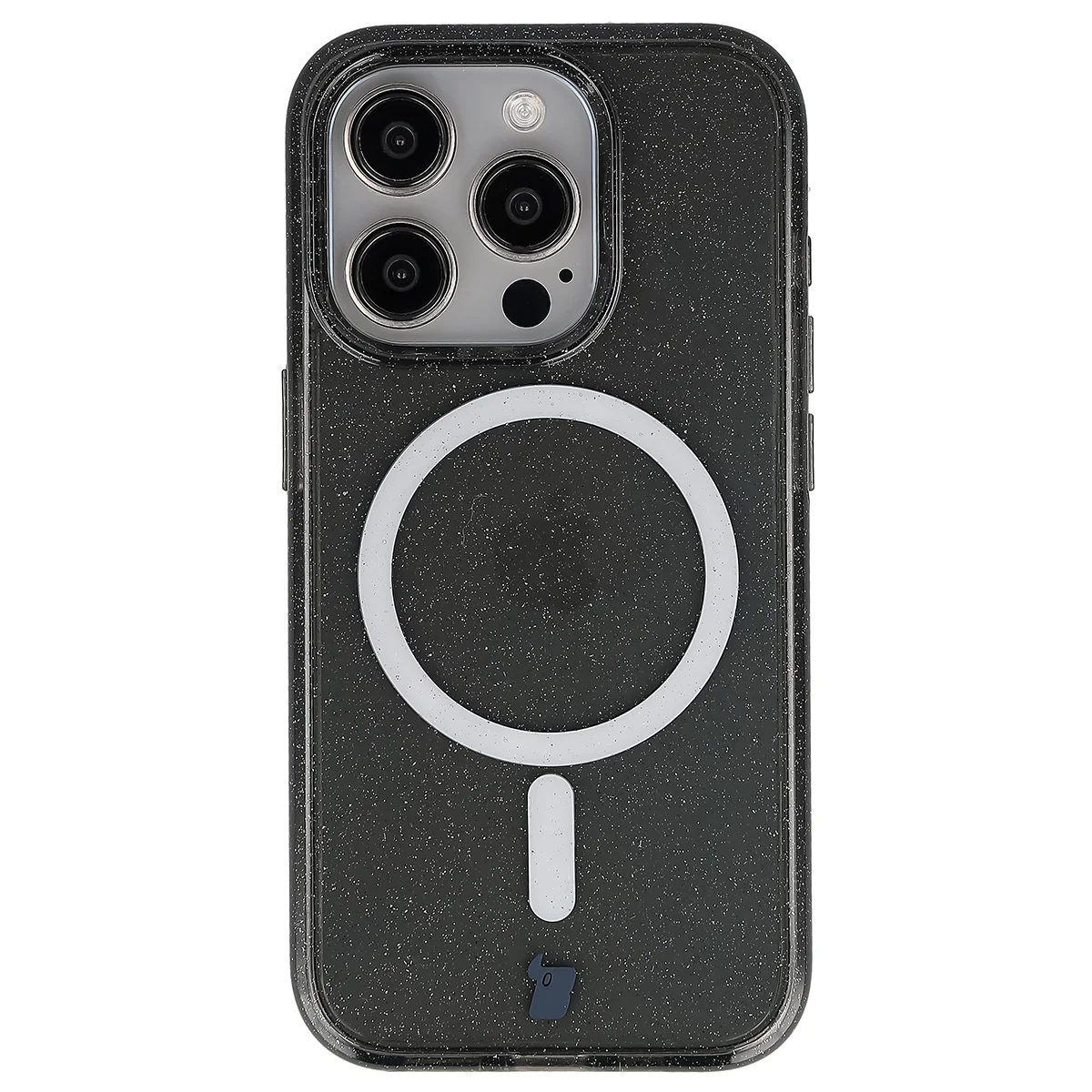 Etui brokatowe z pierścieniem magnetycznym Bizon Case SparklO do iPhone 15 Pro, przezroczysto-czarne z brokatem