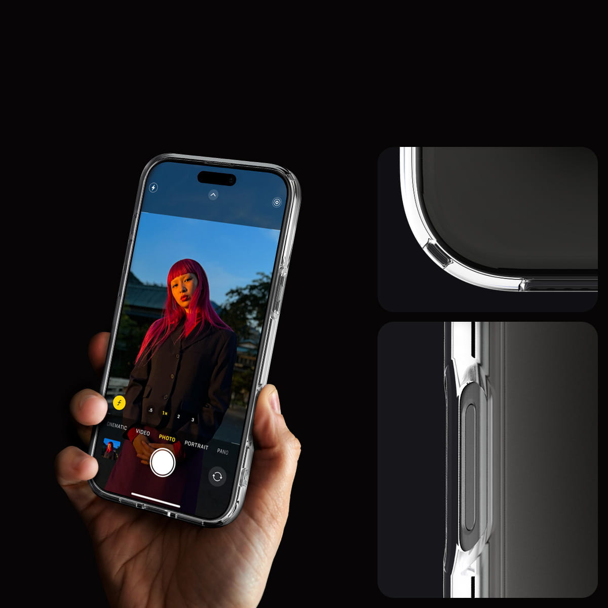 Etui zapewnia solidną ochronę przy minimalnych gabarytach oraz wadze podczas upadków. Dzięki technologii Air Cushion®, czyli poduszek powietrznych umiejscowionych w narożnikach, skutecznie amortyzuje wstrząsy od upadków, spełniając wymogi standardu odporności Mil-Grade.