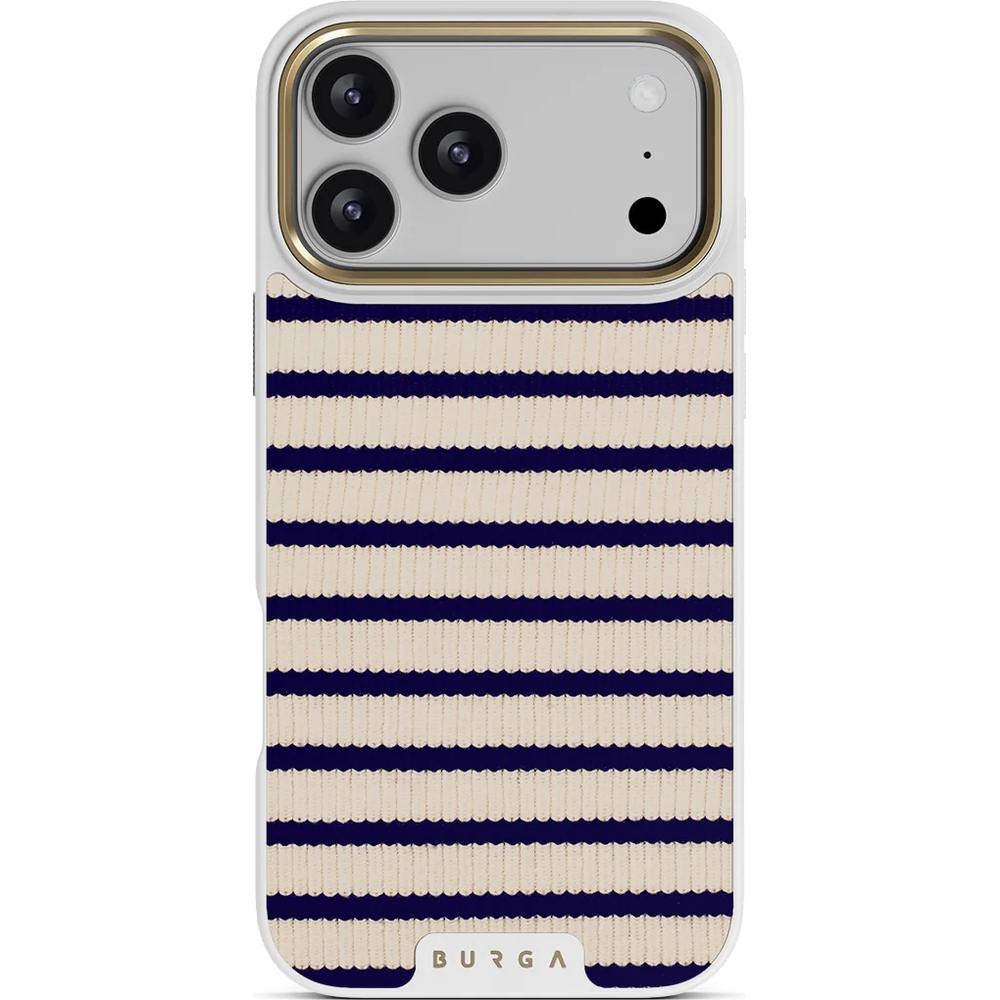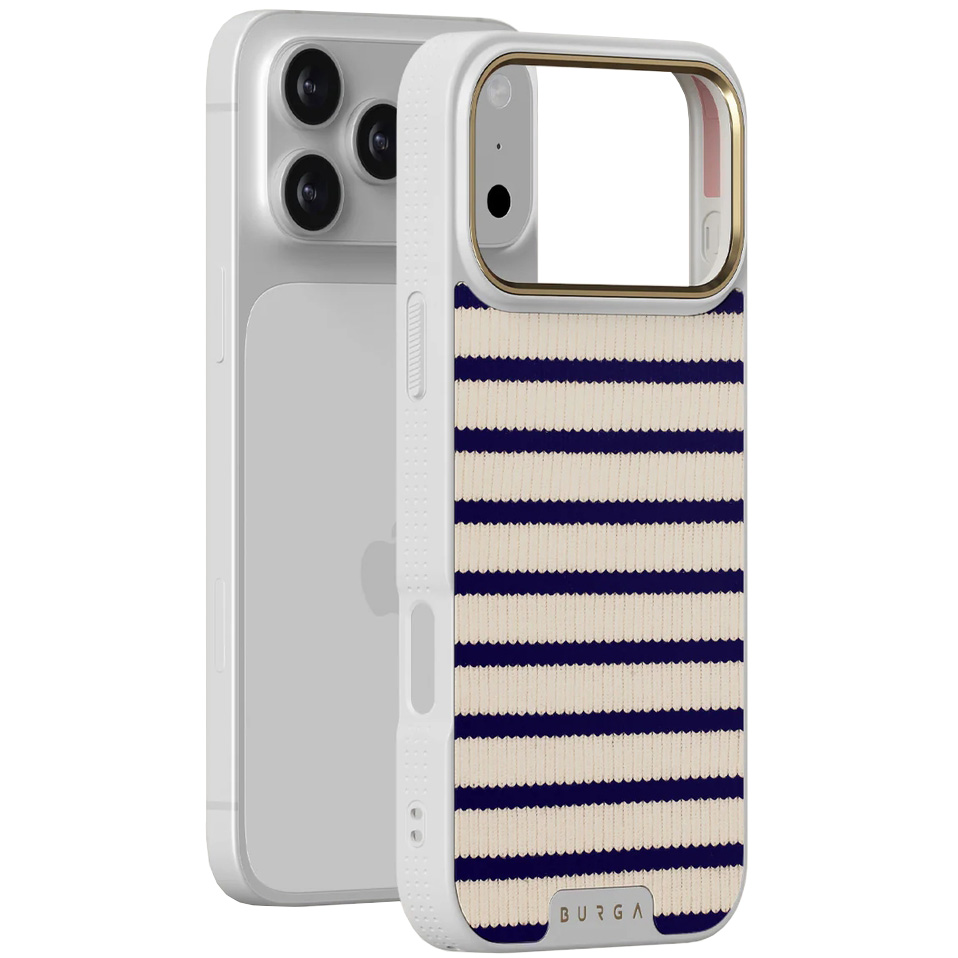 Kolor producenta: Old Money Gold - Etui w kremowo-granatowej kolorystyce z klasycznym wzorem w paski nawiązuje do ponadczasowego stylu old money, a złota ramka wokół aparatu dodaje całości eleganckiego, luksusowego wykończenia.