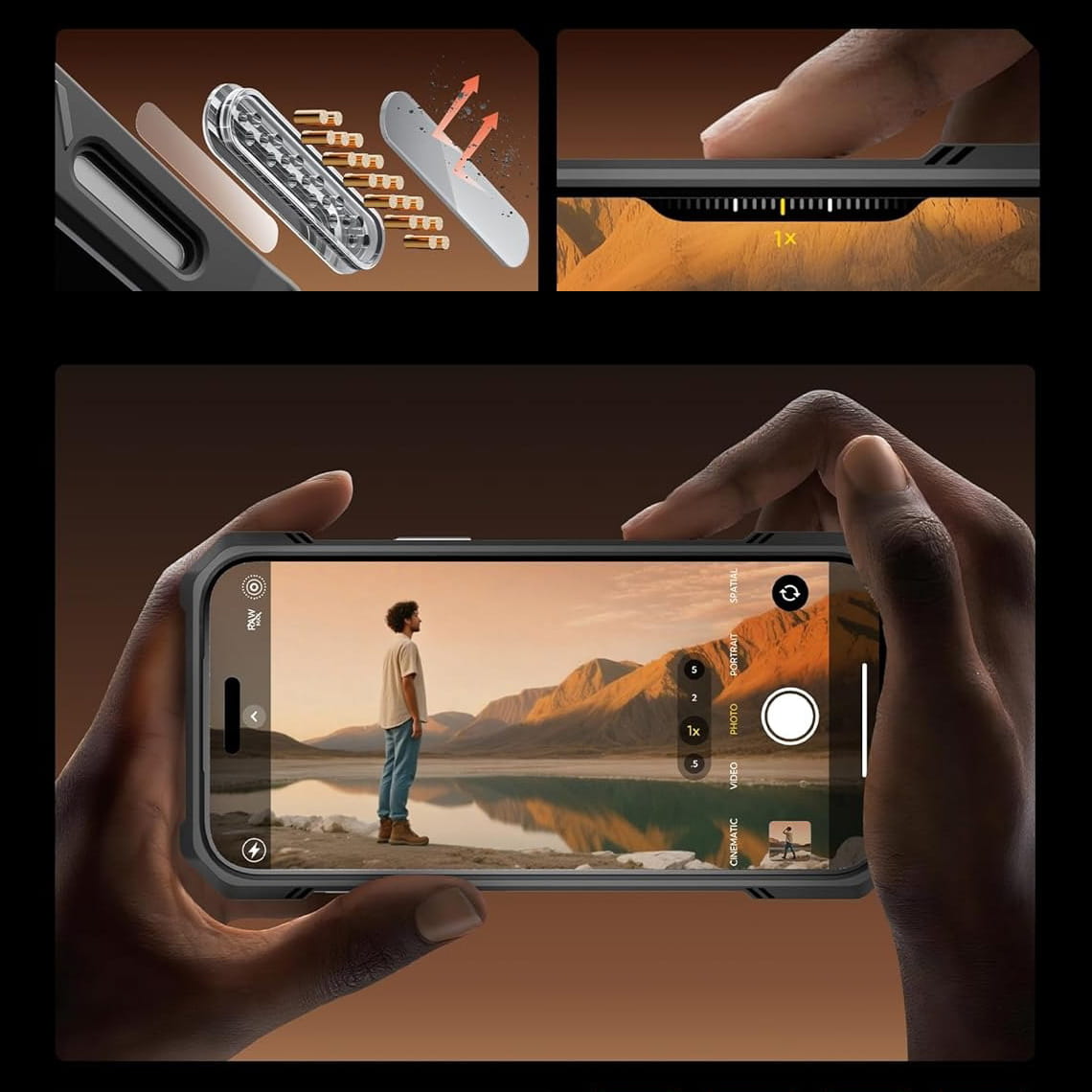 Taka hybrydowa kombinacja z funkcjonalnymi dodatkami zabezpiecza kompleksowo urządzenie z każdej strony i oferuje wyjątkowo dużą wytrzymałość od wstrząsów, klasyfikując pokrowiec jako typowy "heavy-duty case" od upadków.