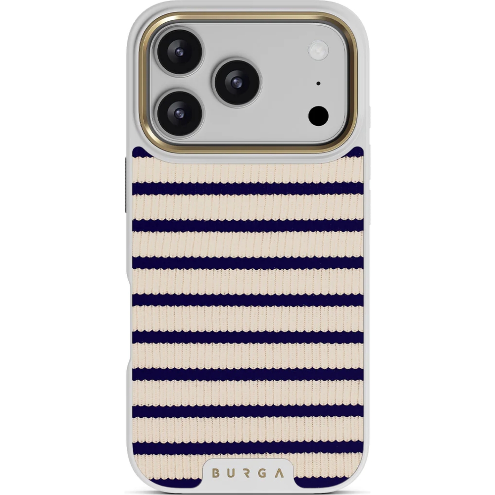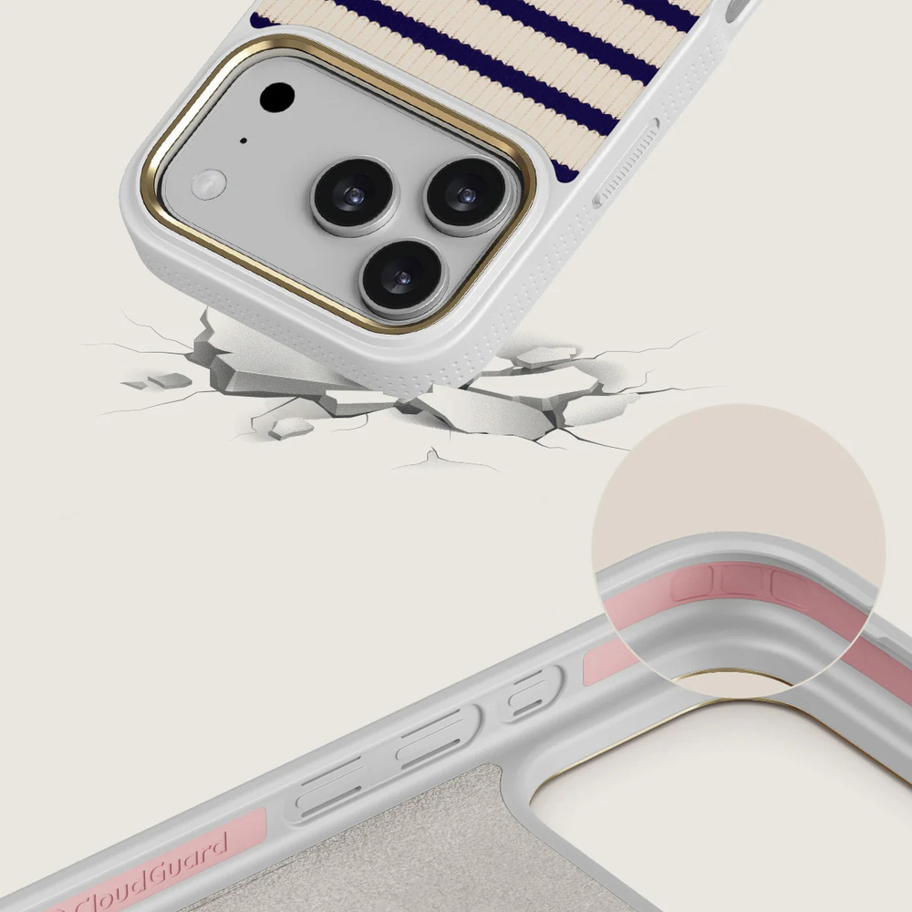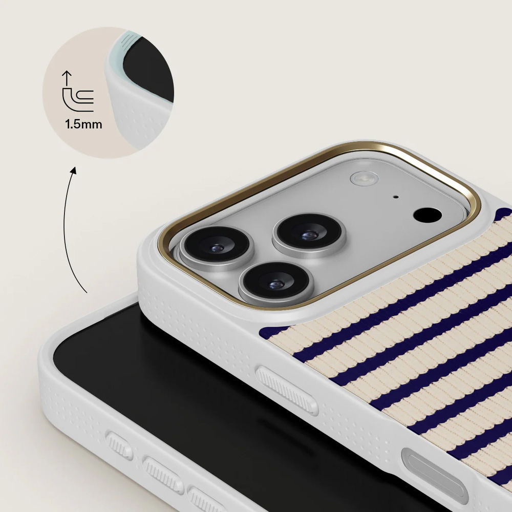 Kolor producenta: Old Money Gold - Etui w kremowo-granatowej kolorystyce z klasycznym wzorem w paski nawiązuje do ponadczasowego stylu old money, a złota ramka wokół aparatu dodaje całości eleganckiego, luksusowego wykończenia.