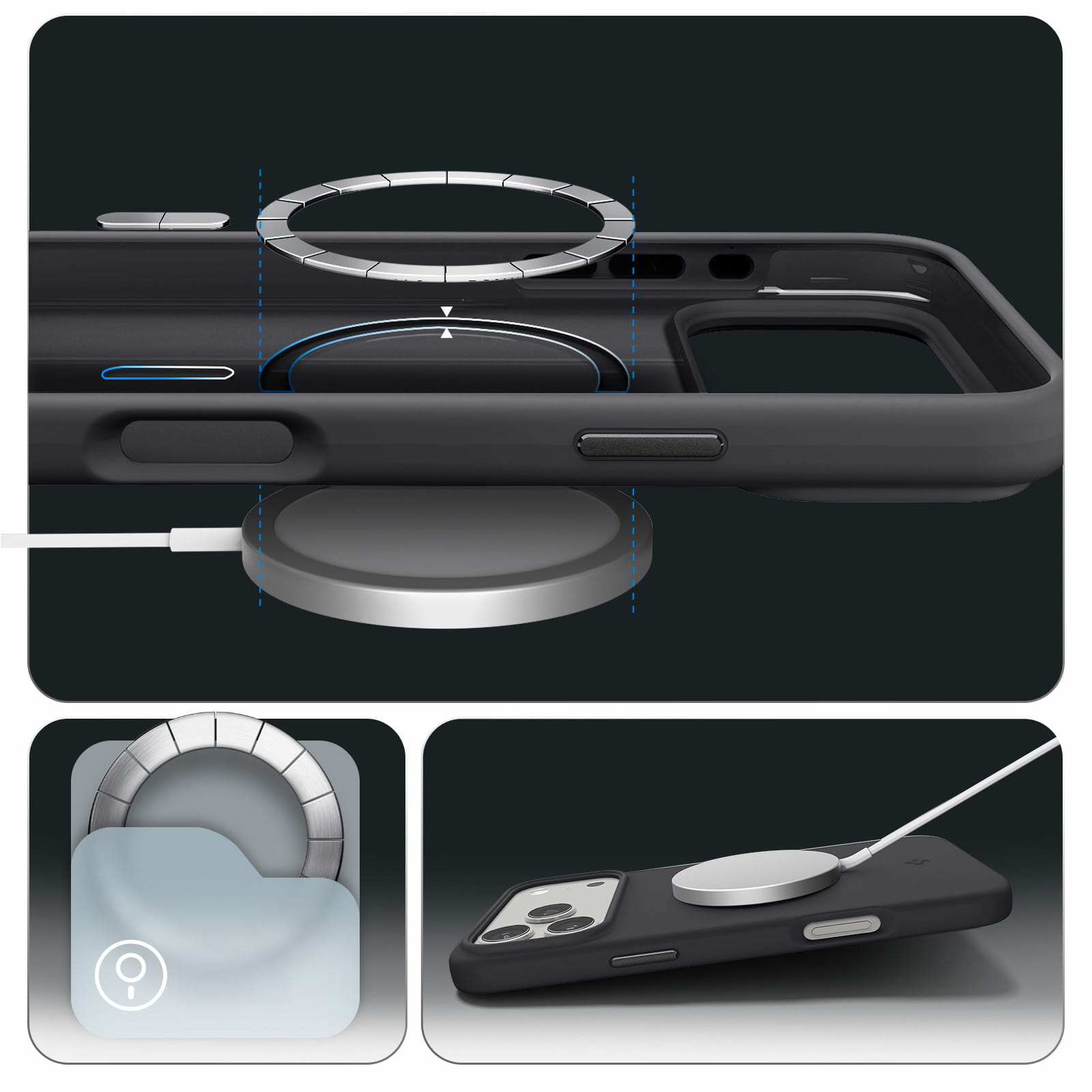 Wewnątrz etui znajduje się wbudowany pierścień magnetyczny zapewniający kompatybilność z akcesoriami z serii MagSafe. Dzięki niemu nadal możesz korzystać z posiadanej ich gamy bez potrzeby zdejmowania pokrowca.