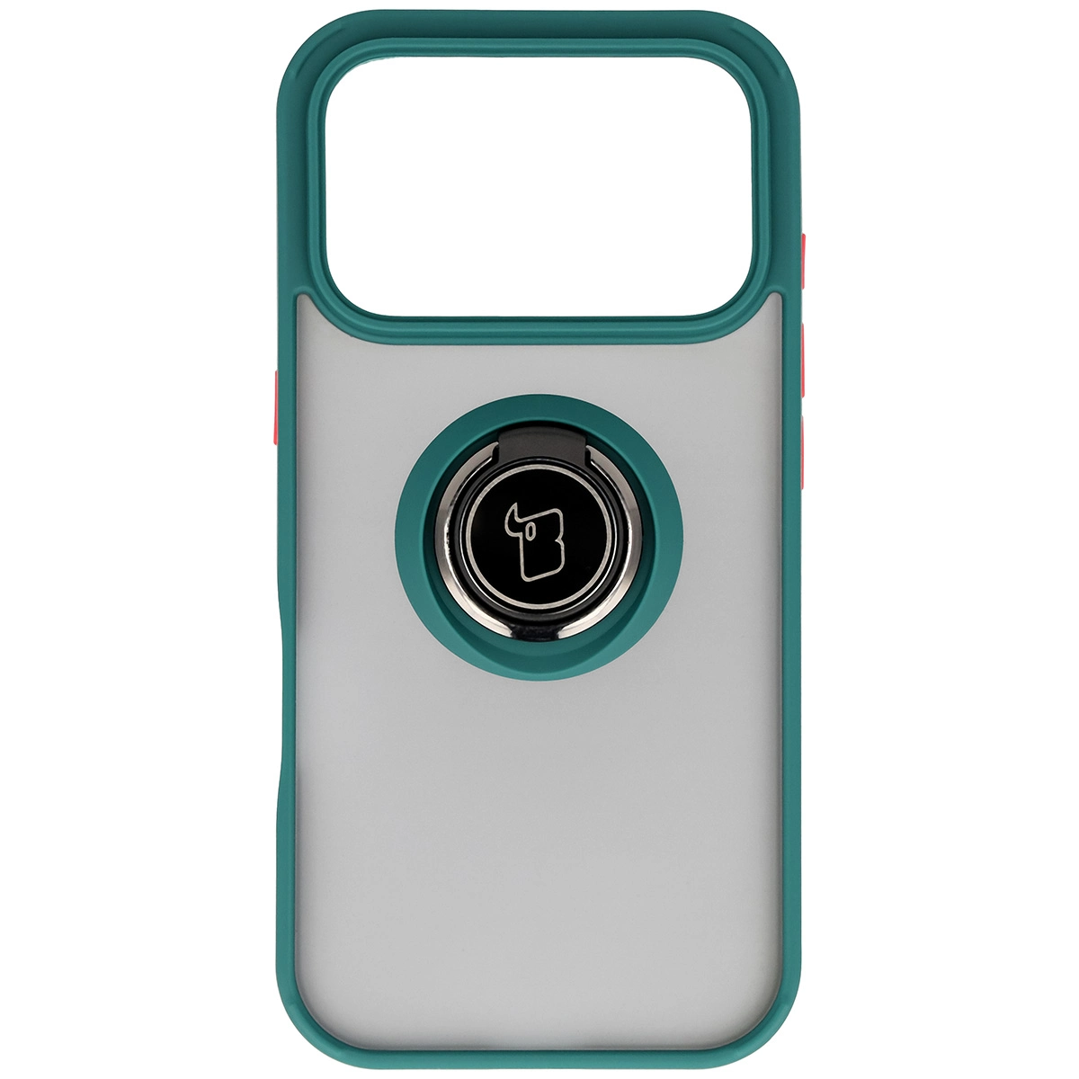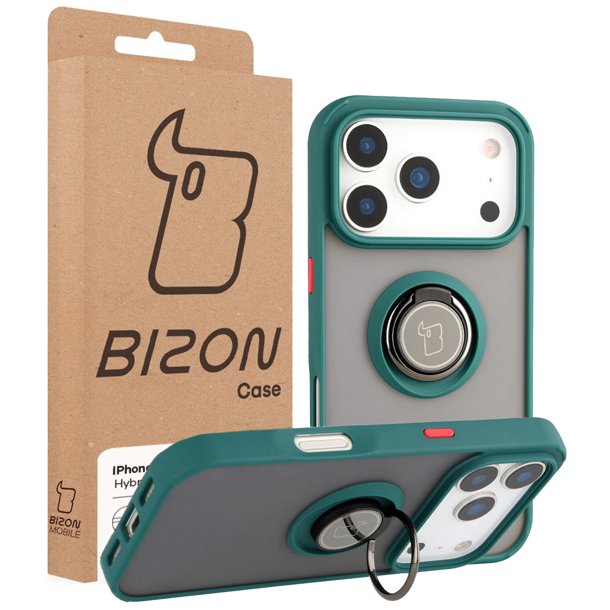 Etui z uchwytem na palec Bizon Case Hybrid Ring do iPhone 17 Pro, przydymione z ciemnozieloną ramką