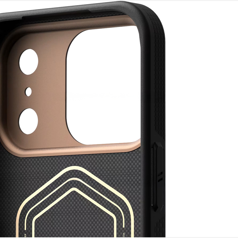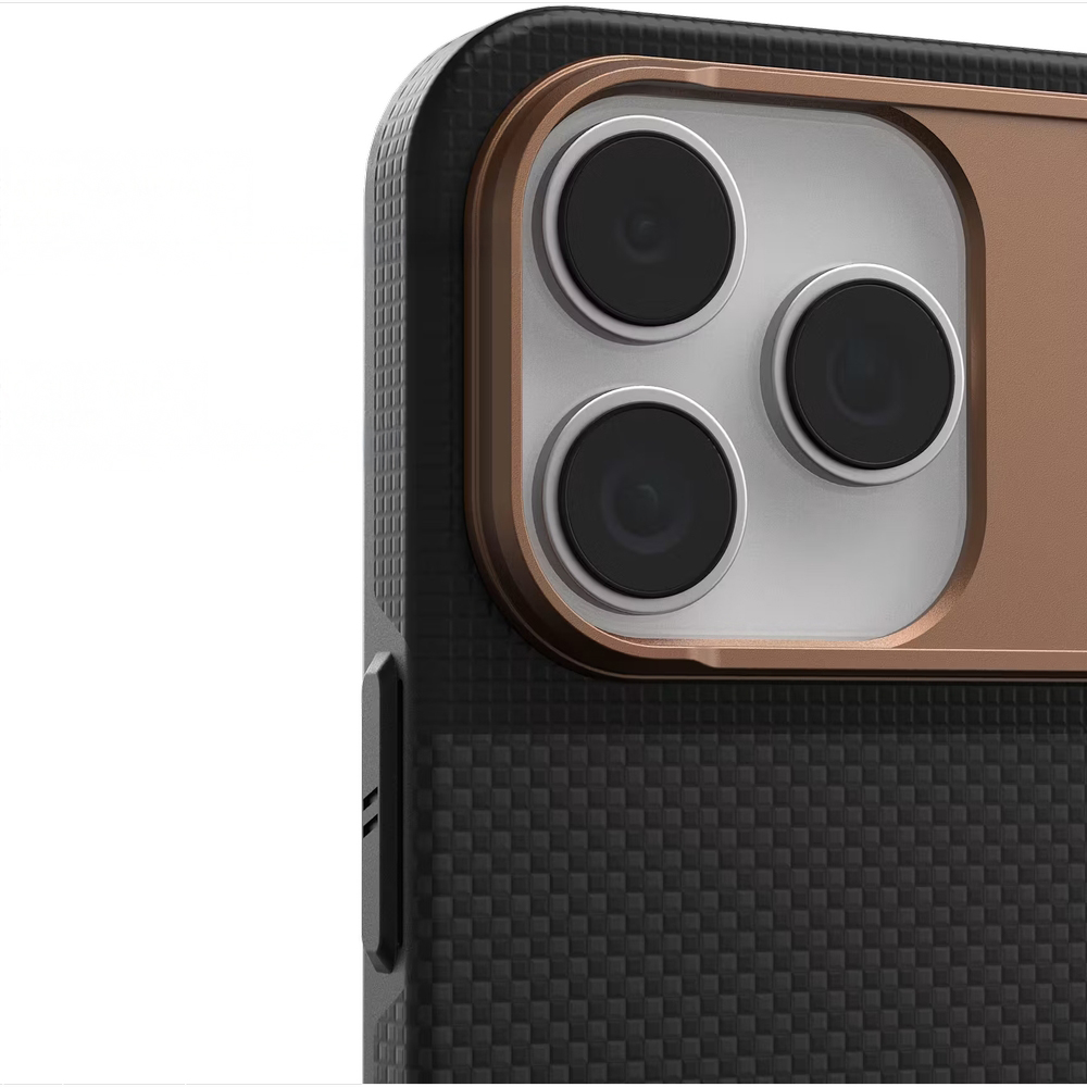 Podniesiona metaliczna ramka aparatu odsuwa wrażliwe soczewki od powierzchni blatu, zmniejszając ryzyko zarysowań podczas odkładania urządzenia. Subtelne metaliczne akcenty, powiększone przyciski z wyraźnym klikiem oraz zintegrowane punkty kotwiczenia smyczy podkreślają dopracowany charakter etui i pomagają wygodniej sterować urządzeniem, jednocześnie zwiększając jego zabezpieczenie w ruchu.
