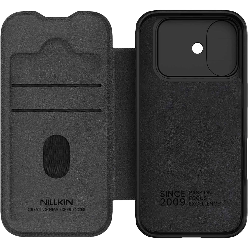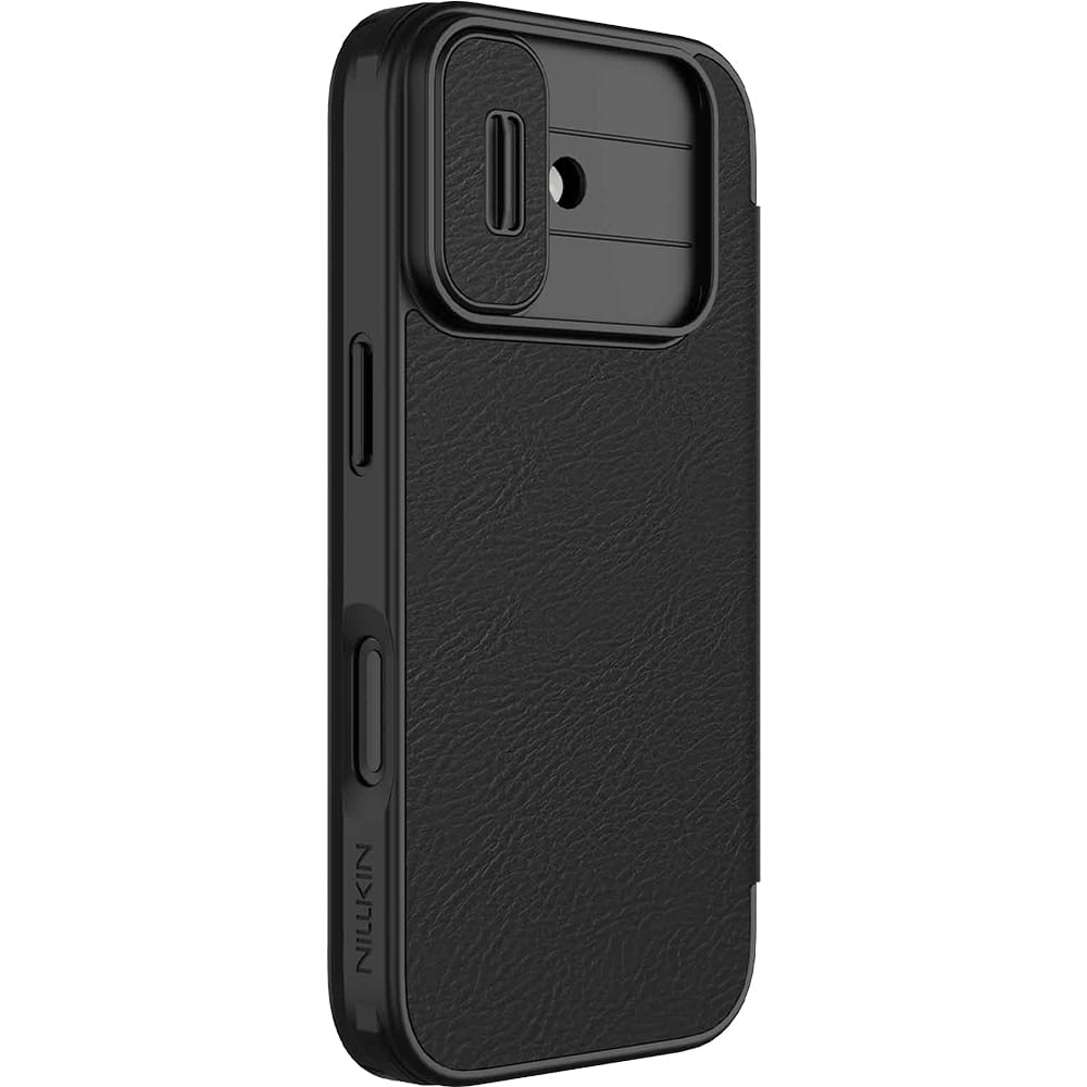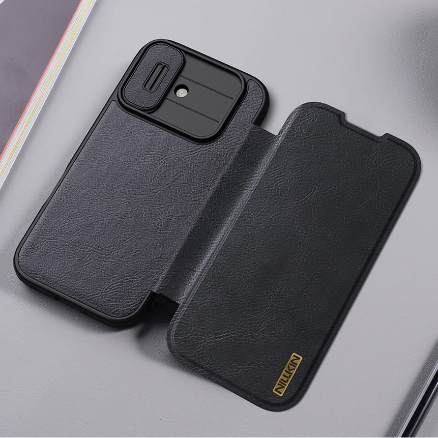 Etui z klapką i ochroną aparatu Nillkin Qin Pro do iPhone 17, czarne