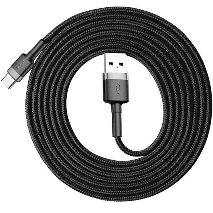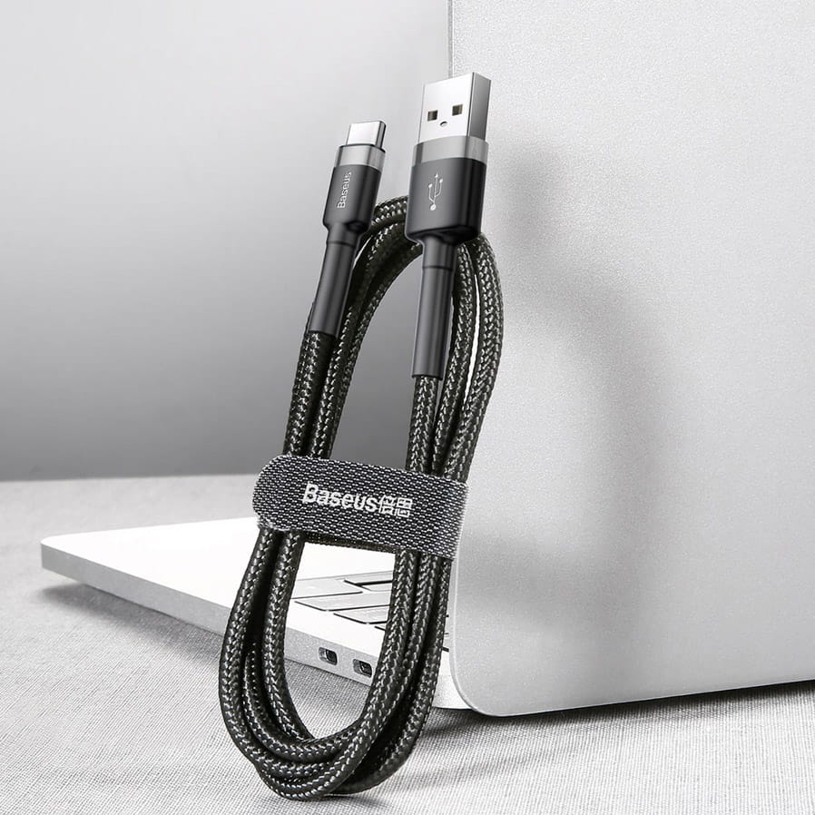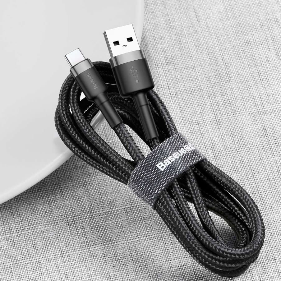 Mocny kabel ładujący i synchronizujący dane marki Baseus z serii Cafule wykonany z wysokiej jakości stopu aluminium, wykończony oplotem nylonowym z końcówkami wzmocnionymi termoplastycznym elastomerem.