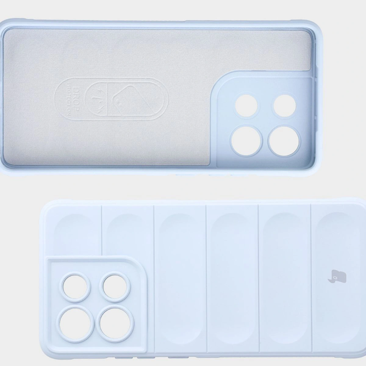 Przywodzące na myśl opony samochodowe, teksturowane boki, zapewniają lepszy chwyt, a gdyby urządzenie i tak upadło — tak jak kanapka, masłem w dół — to nie zderzy się bezpośrednio z podłogą, bo obudowa wystaje ponad krańce telefonu! Podwyższone krawędzie otaczają również wyspę aparatu, co w połączeniu z dedykowanymi wycięciami na soczewki stanowi solidną ochronę obiektywów.