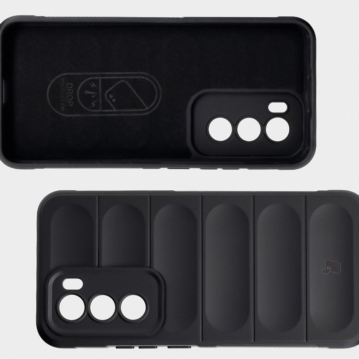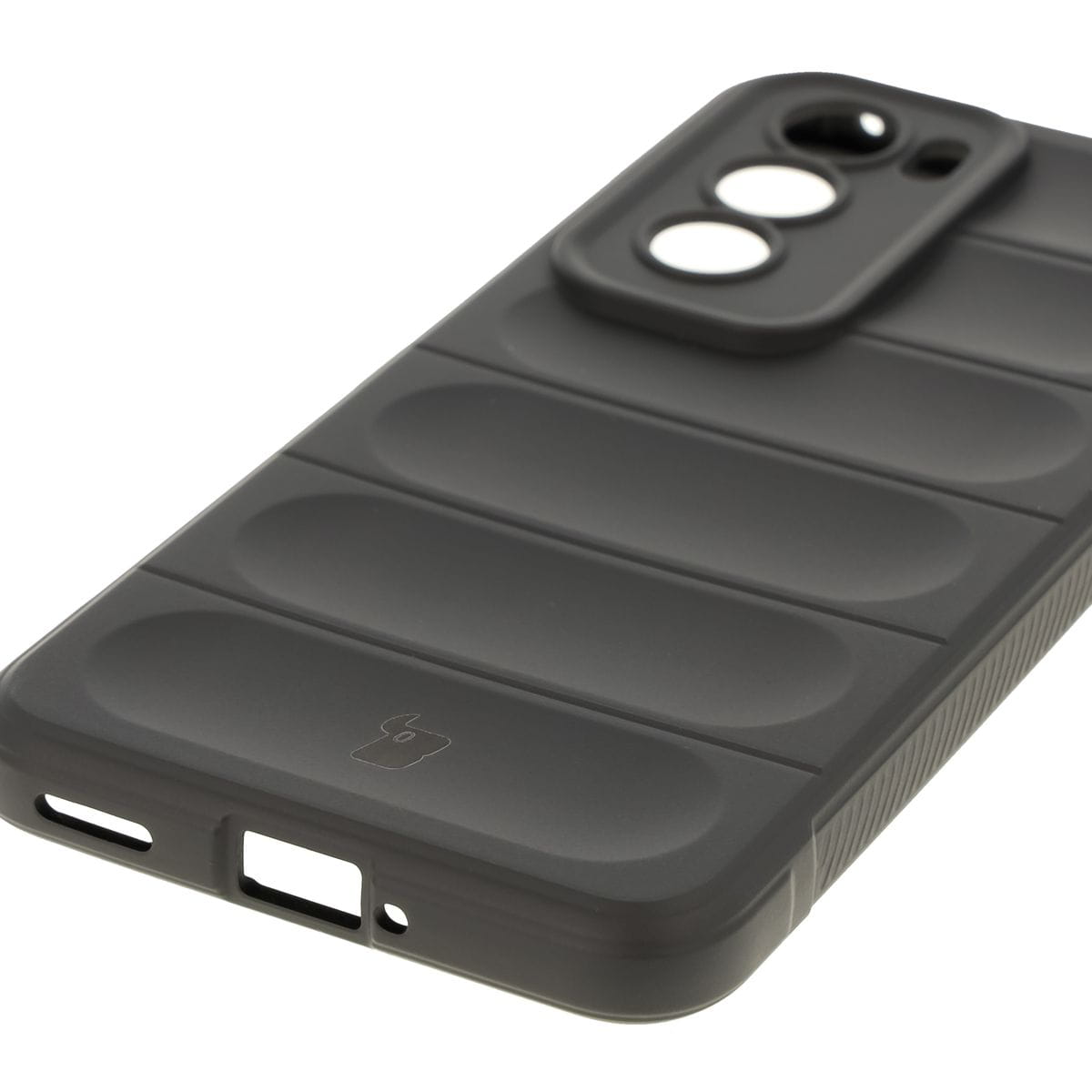 Przywodzące na myśl opony samochodowe, teksturowane boki, zapewniają lepszy chwyt, a gdyby urządzenie i tak upadło — tak jak kanapka, masłem w dół — to nie zderzy się bezpośrednio z podłogą, bo obudowa wystaje ponad krańce telefonu! Podwyższone krawędzie otaczają również wyspę aparatu, co w połączeniu z dedykowanymi wycięciami na soczewki stanowi solidną ochronę obiektywów.