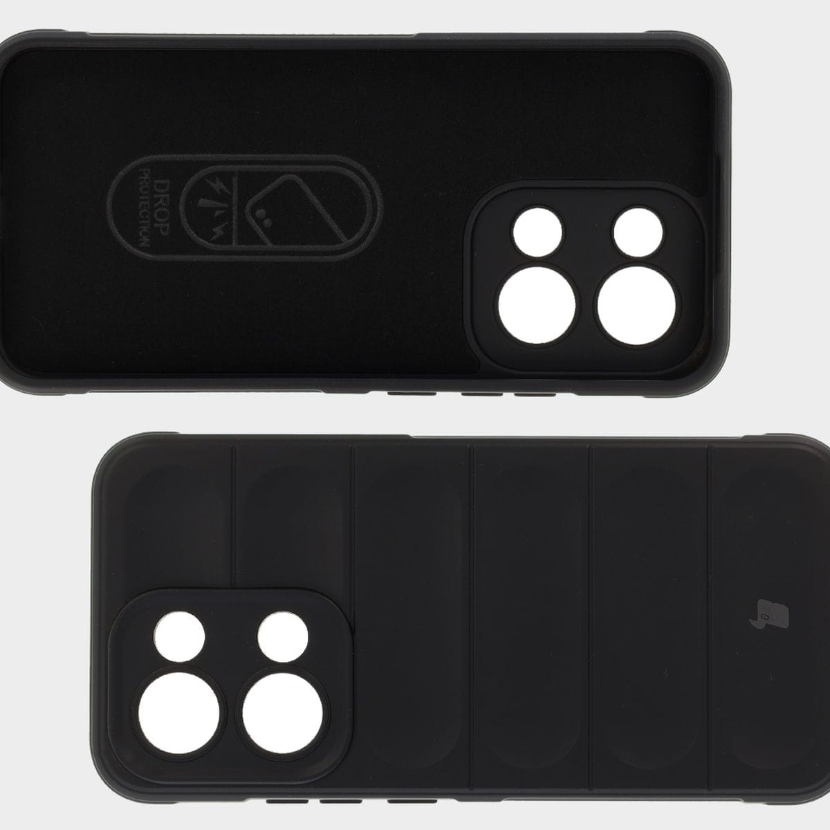 Przywodzące na myśl opony samochodowe, teksturowane boki, zapewniają lepszy chwyt, a gdyby urządzenie i tak upadło — tak jak kanapka, masłem w dół — to nie zderzy się bezpośrednio z podłogą, bo obudowa wystaje ponad krańce telefonu! Podwyższone krawędzie otaczają również wyspę aparatu, co w połączeniu z dedykowanymi wycięciami na soczewki stanowi solidną ochronę obiektywów.