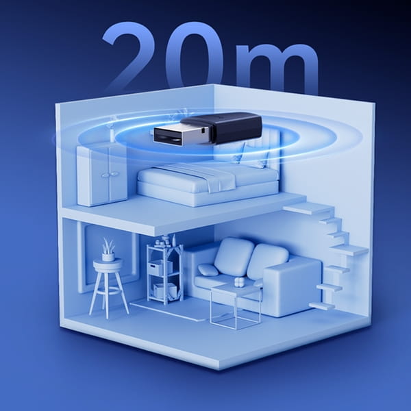 Obudowa wykonana z połączenia ABS i metalu zapewnia większą odporność na codzienne wkładanie oraz wyjmowanie z portu, a ochronna zaślepka dba o czystość złącza w trakcie transportu. Niewielki, kompaktowy format adaptera nie zasłania sąsiednich portów USB, dzięki czemu urządzenie może bez przeszkód pozostać na stałe w laptopie lub komputerze stacjonarnym. W ten sposób łatwo przeniesiesz swoje stanowisko na standard bezprzewodowy i na co dzień utrzymasz większy porządek na biurku, zachowując swobodę konfiguracji sprzętu.