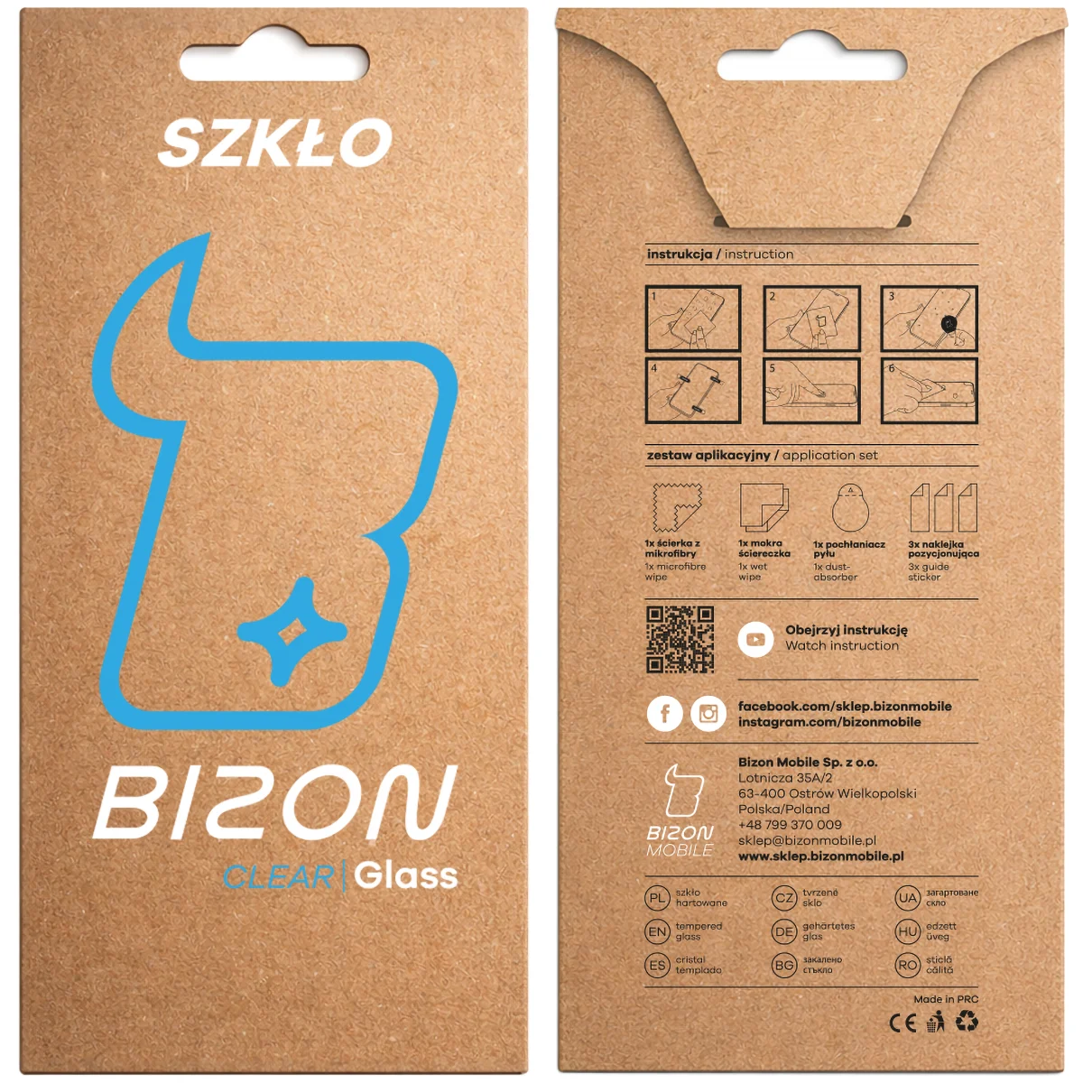 Bizon Glass Clear, oprócz 1 sztuki szkła hartowanego, zawiera również mokrą ściereczkę, suchą ściereczkę z mikrofibry, Dust Absorbera i 3 naklejki pozycjonujące.