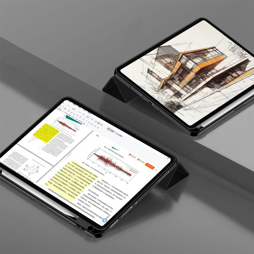 Klapka posiada wewnątrz delikatną wyściółkę chroniącą ekran przed zarysowaniami, a także funkcję wybudzania i usypiania ekranu. Etui zostało wyposażone w dedykowane miejsce na rysik*, pozwalając na bezpieczne użytkowanie bez ryzyka zgubienia.