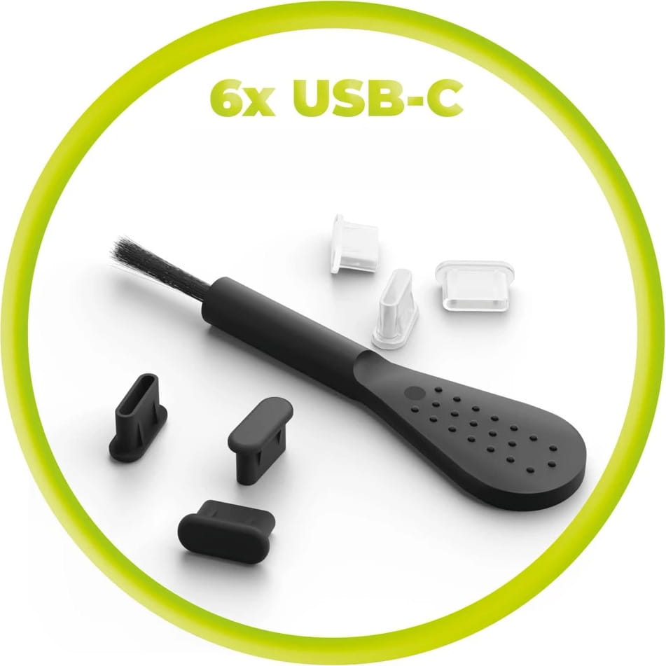 Zatyczki, szczoteczka, Mobile Origin USB-C Dust Plug & Cleaning Brush dla urządzeń z portem typu C, czarne, przeźroczyste 6 sztuk